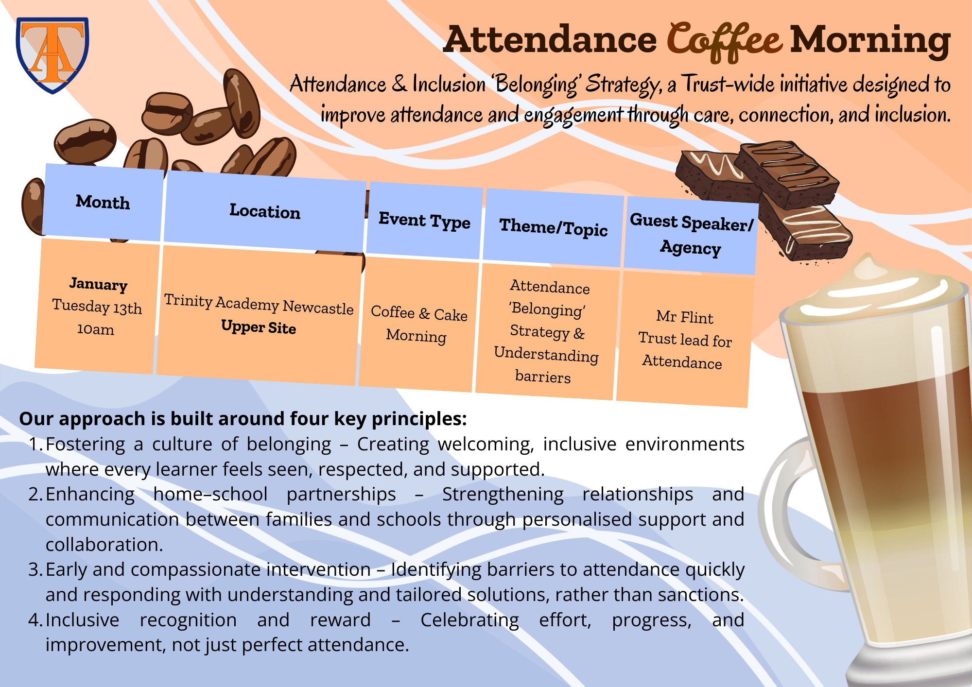 We would like to invite you to our whole Academy coffee morning, we have a series of parental engagement events planned, which we will rotate between the Upper and Lower sites. Our first event is to introduce our new 'belonging strategy'. We hope to see you at our first event. Your support is crucial in building a stronger and more successful school community.