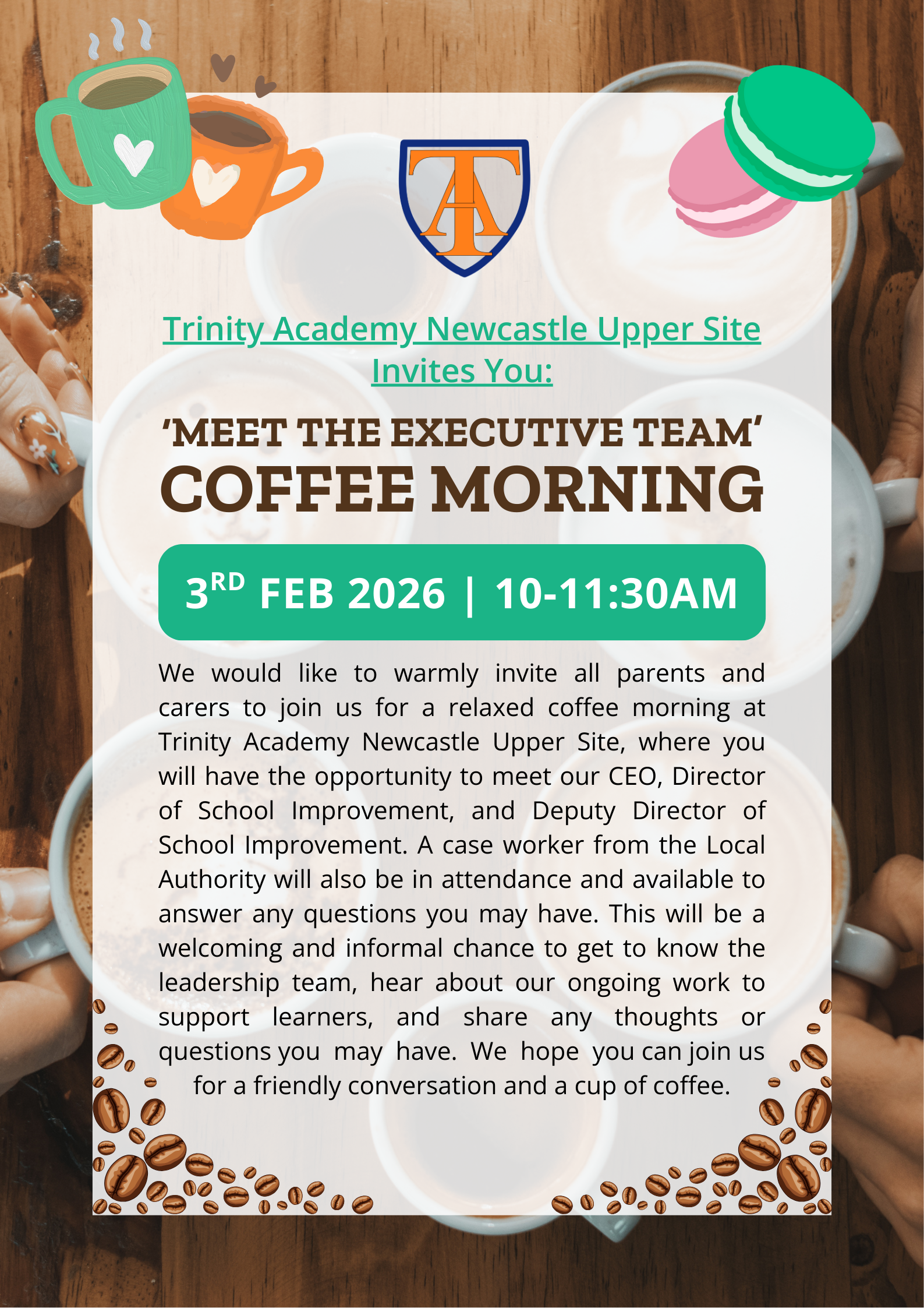 We would like to warmly invite all parents and carers to join us for a relaxed coffee morning at Trinity Academy Newcastle Upper Site, where you will have the opportunity to meet our CEO, Director of School Improvement, and Deputy Director of School Improvement.